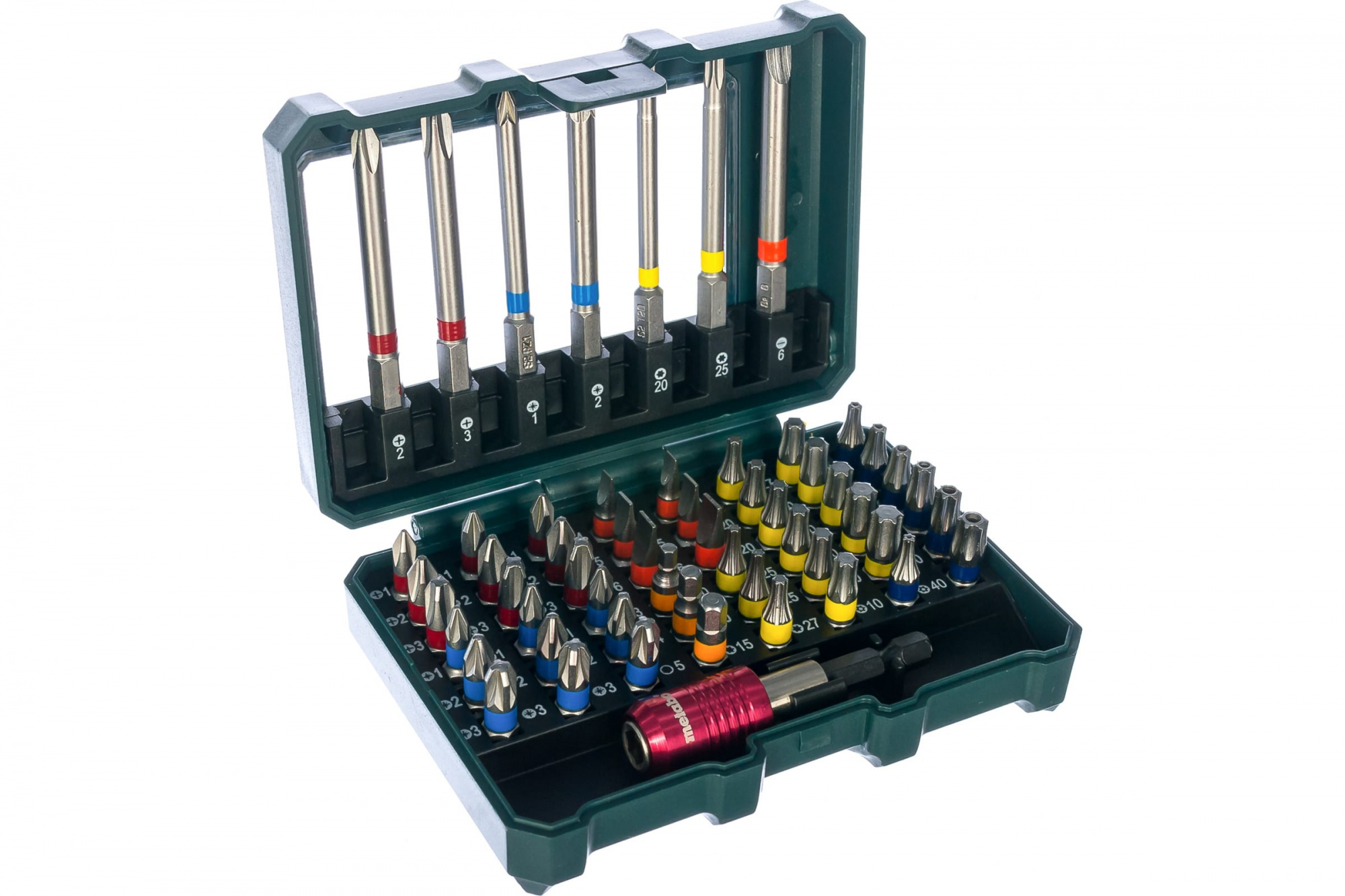 Набор бит Metabo 626702000 поставляется в удобном боксе. В нем собраны различные биты для смены оснастки с разными шлицами. Биты изготовлены из хромованадиевой стали.
