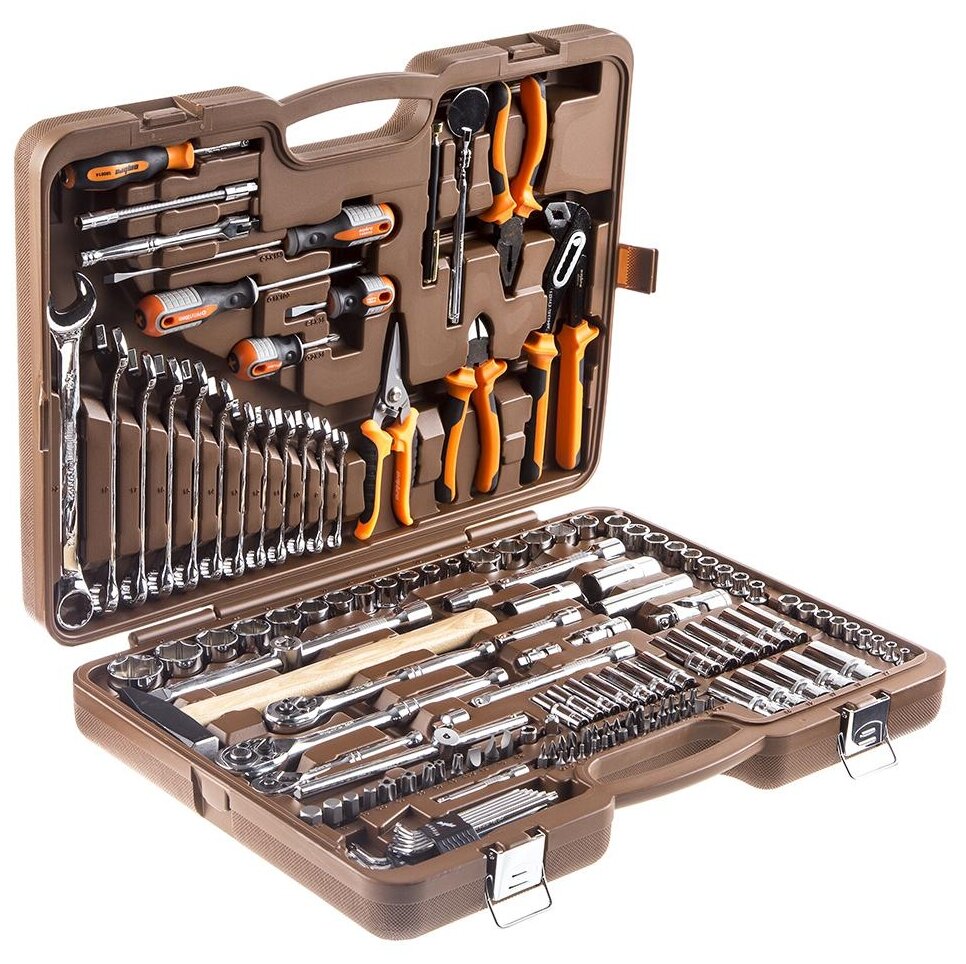 Инструменты : бокорезы, вороток для головок, клещи, клещи переставные, ключи гаечные, кусачки, молоток, отвёртки, пассатижи, рукоять для бит, трещотка