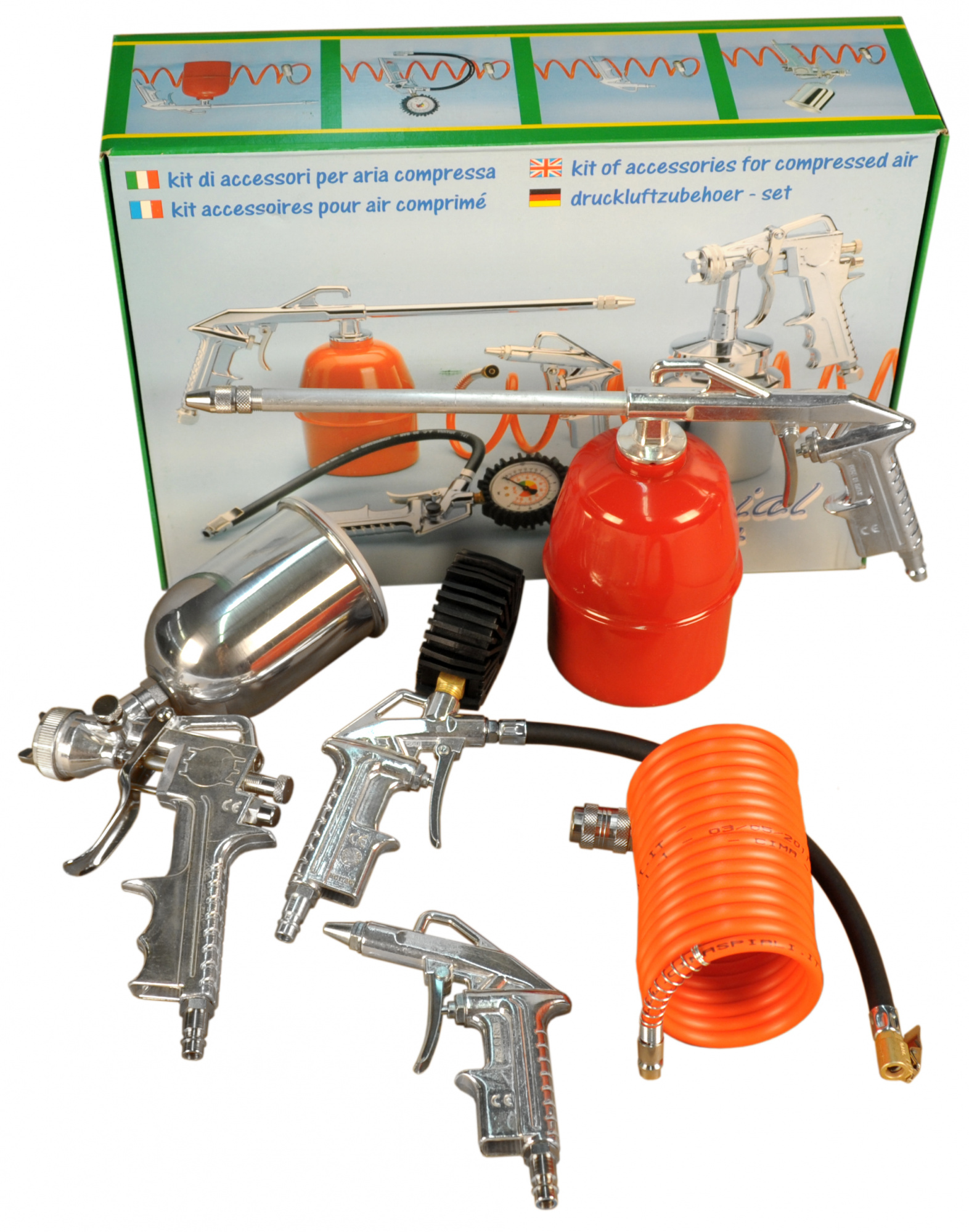 Универсальный набор для компрессора Elitech 0704.000201. Набор предназначен для покрасочных, шиномонтажных и антикоррозионных работ. В комплект входит краскораспылитель, пистолет с манометром для накачки шин, комплект из трех наконечников, насадка для продувки. Дополнена комплектация гибким пятиметровым резиновым шлангом с быстроразъемными соединениями.